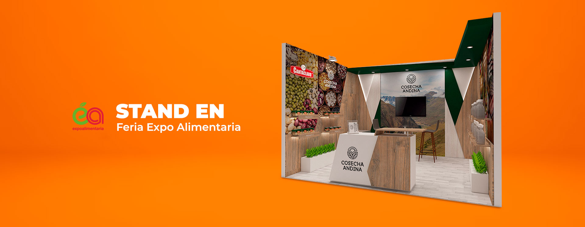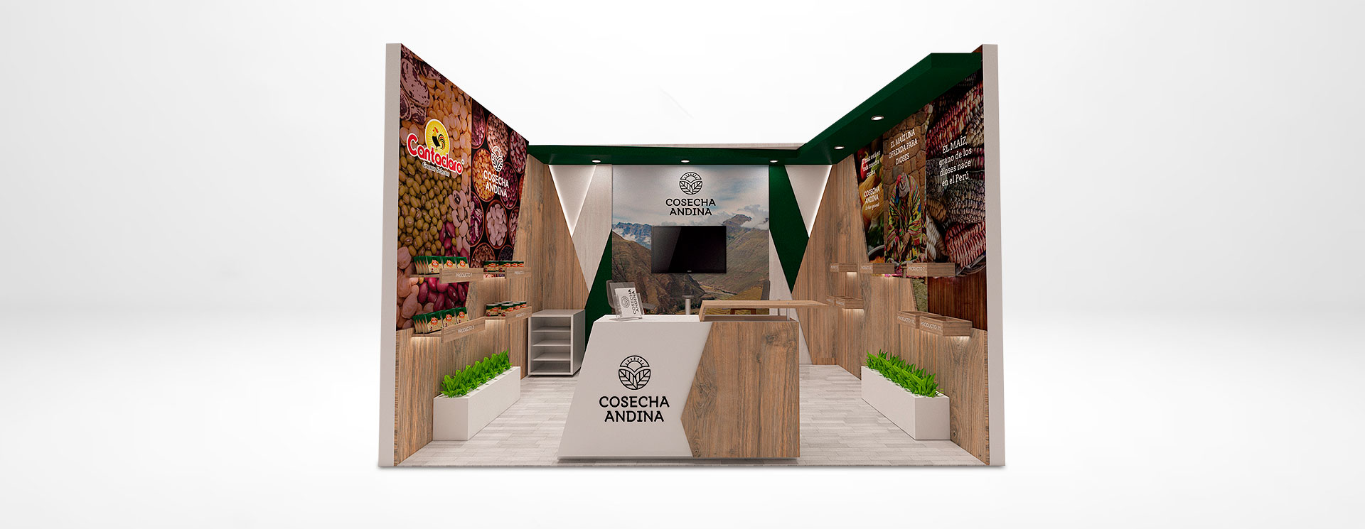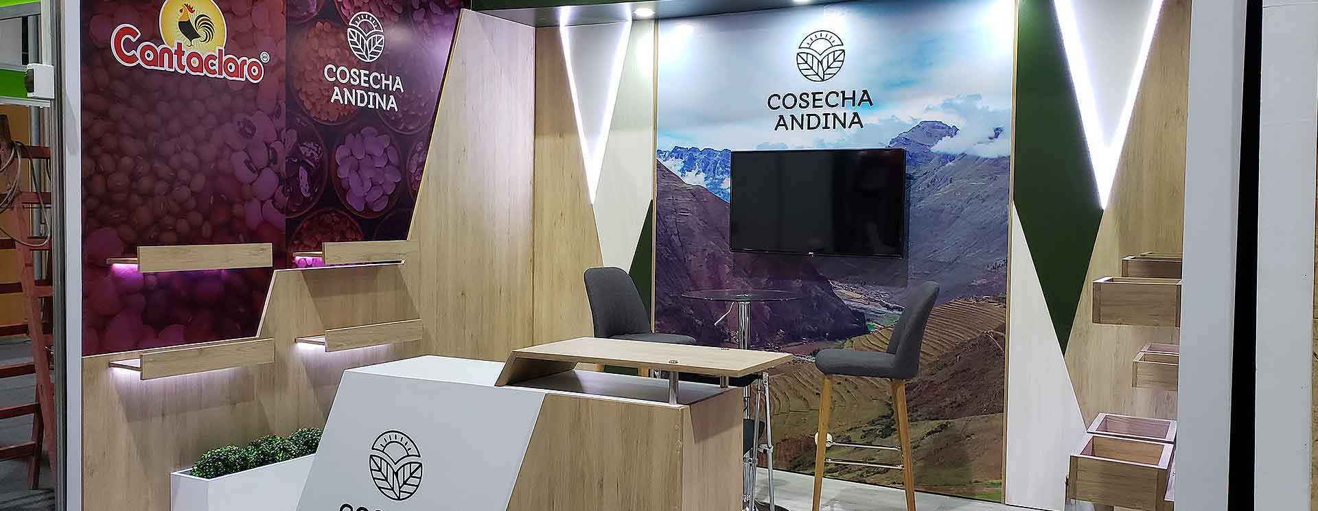 Para Cosecha Andina, se solicitó un stand comecial para Expo Alimentaria 2018 que sirva de exhibición de sus productos de alta calidad. Granos emblemáticos del Perú sobresalen, entre ellos el maíz, en sus variedades chullpi, blanco y mote. Además de darle énfasis a la marca Cantaclaro.