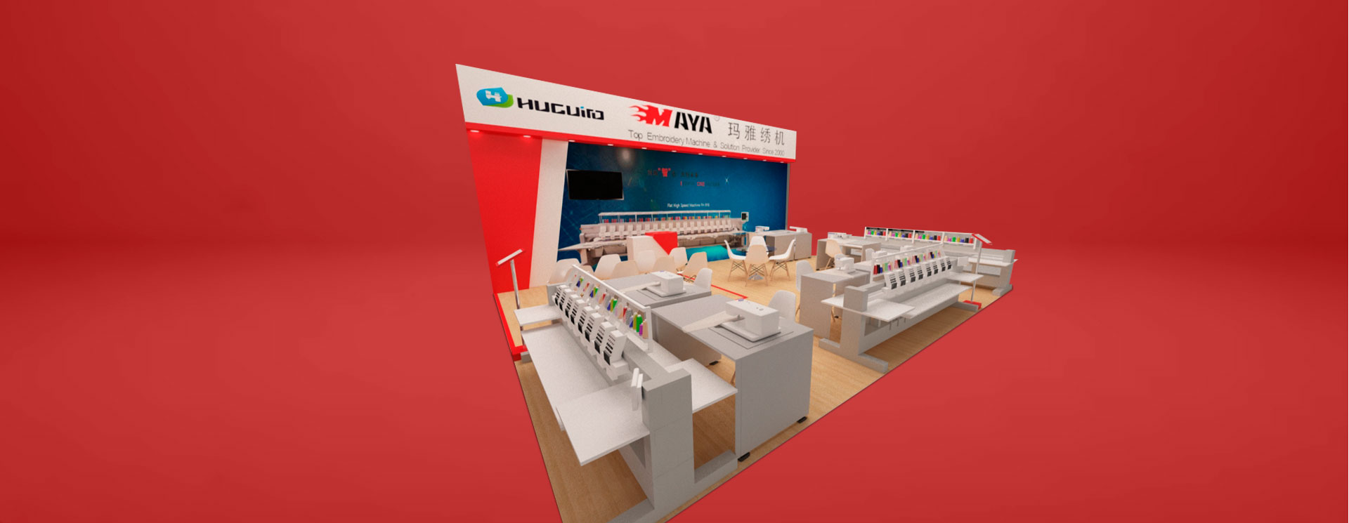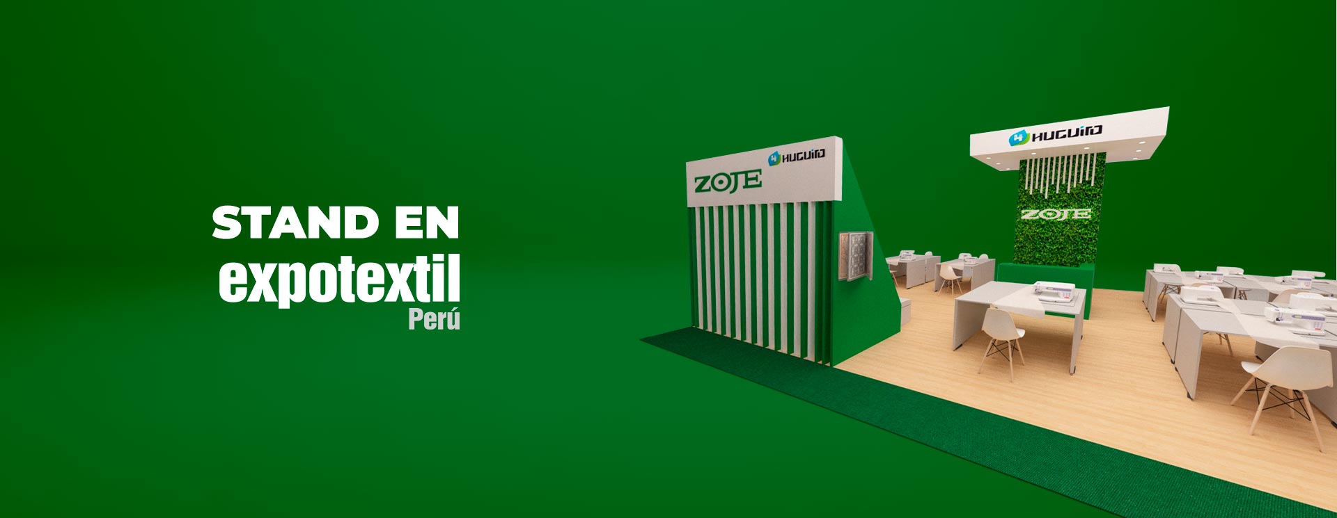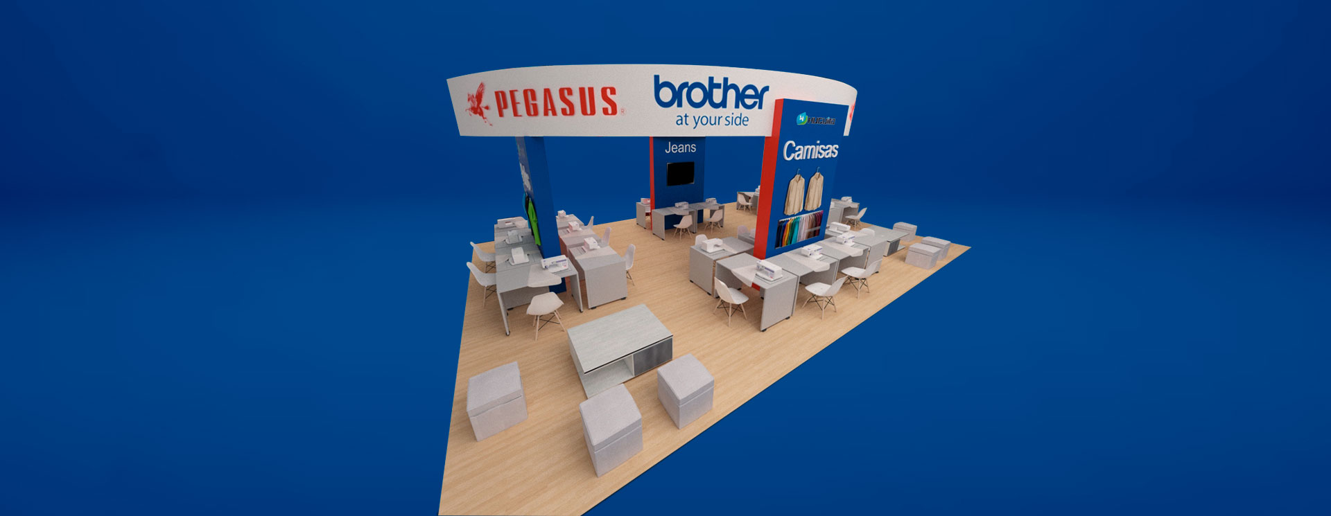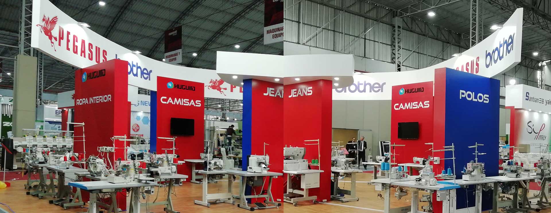 Se le realizó el diseño y la fabricación de un stand de exhibición tipo isla de 243 m2 de diversas marcas de maquinas de coser como Pegasus, Brother, Zoje, Maya en la Feria EXPOTEXTIL 2019 realizada en el Centro de Exposiciones del Jockey.