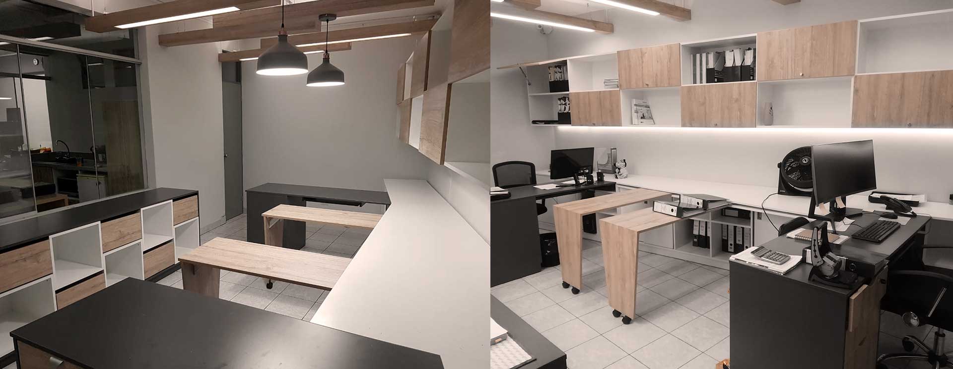 Asimismo se instaló un mueble de melamina y mesa de reuniones en melamina blanco, en la pared situó el logo de la empresa en vinil. Adicional a ello también se remodeló dos areas de ventas y un kitchenette con muebles de melamina con textura de madera y mesas de reuniones corredizas.