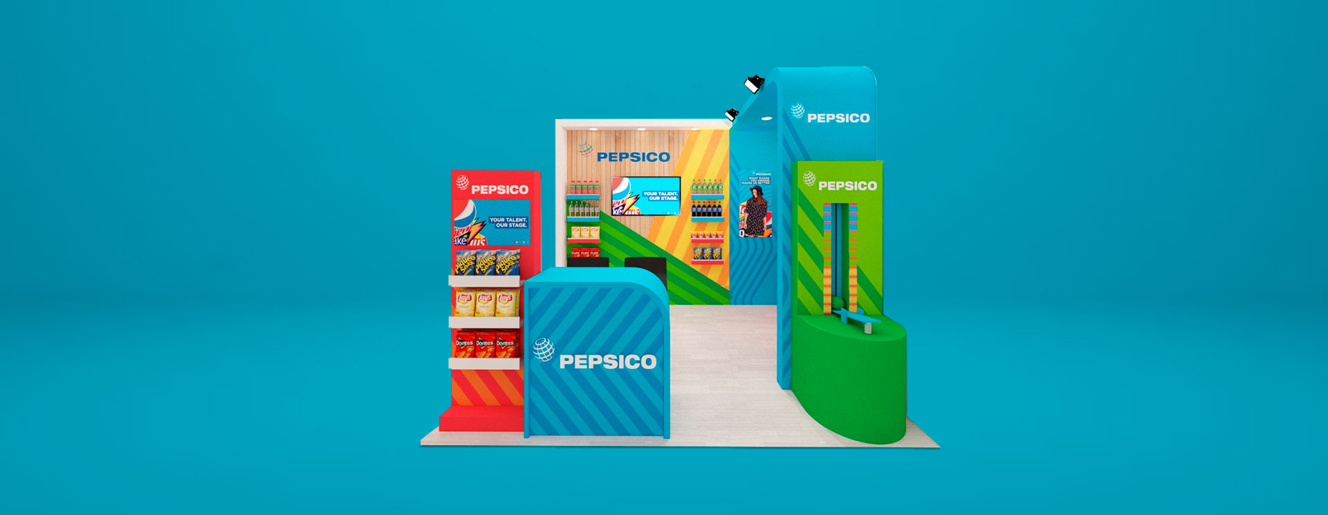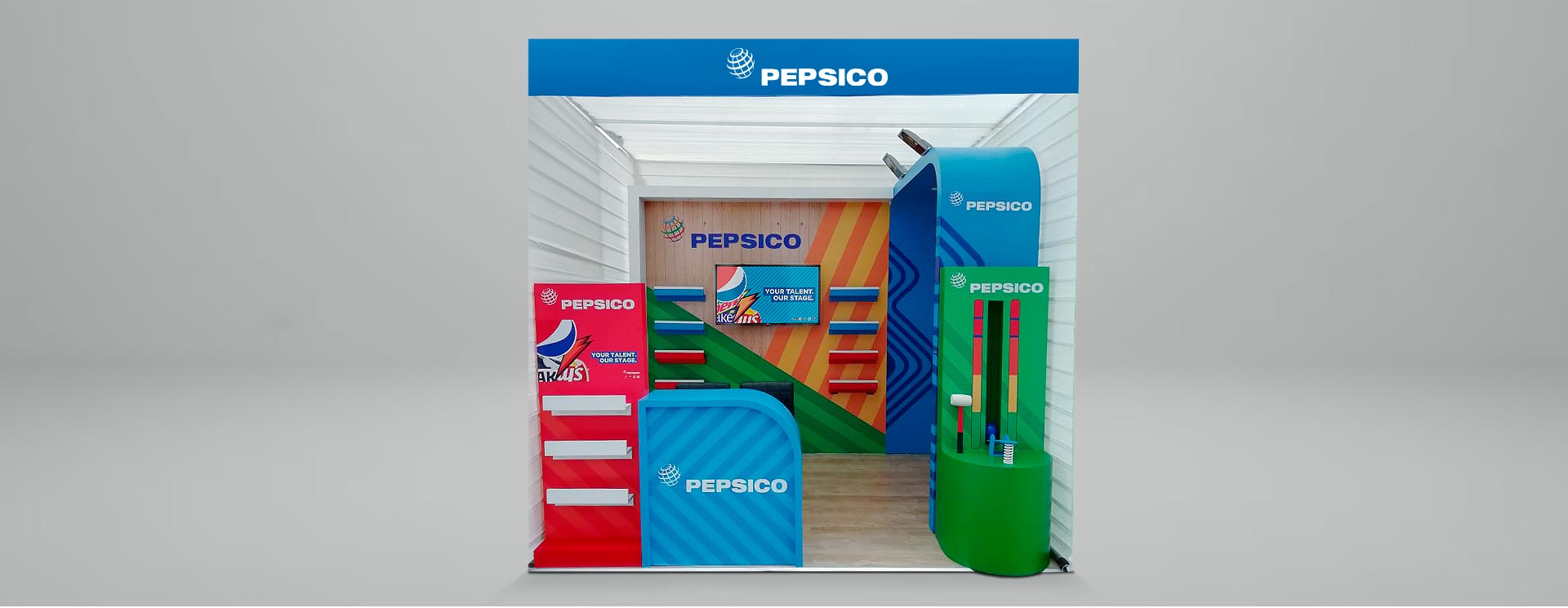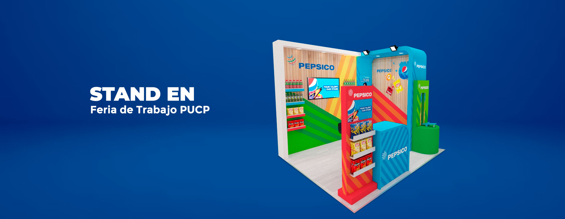 Se realizó el diseño y la fabricación de un stand en venta de 3x2 para la XXIII Feria Laboral de la PUCP, el cual contaba con un counter, repisas para la exposición de sus productos, un juego de fuerza y viniles alusivos a sus productos.